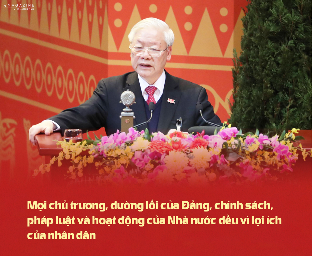 Đặc biệt, Tổng Bí thư nhấn mạnh: “Không chờ đến khi kinh tế đạt tới trình độ phát triển cao rồi mới thực hiện tiến bộ và công bằng xã hội, càng không “hy sinh” tiến bộ và công bằng xã hội để chạy theo tăng trưởng kinh tế đơn thuần”; “mọi chủ trương, đường lối của Đảng, chính sách, pháp luật và hoạt động của Nhà nước đều vì lợi ích của nhân dân”.