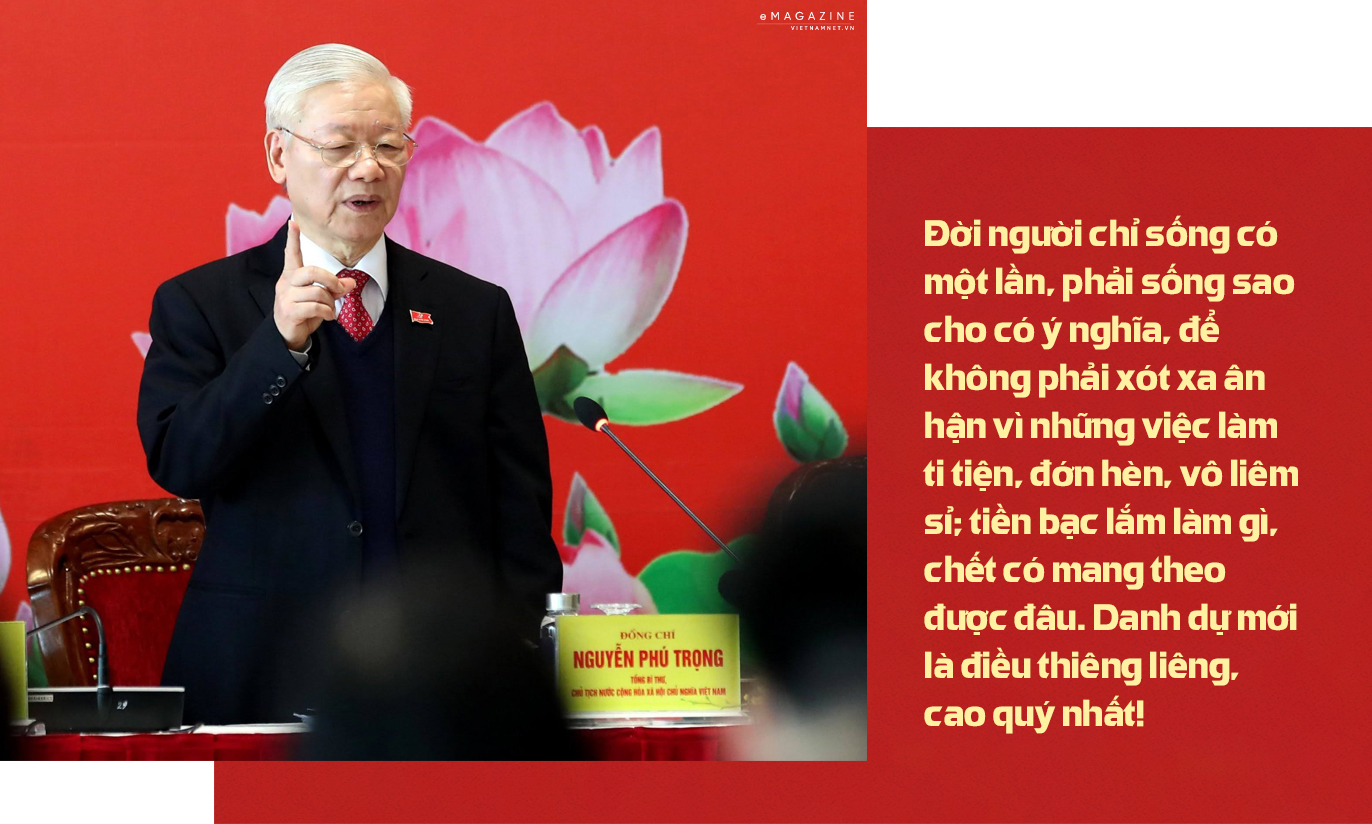 "Tôi đã nhiều lần nói rồi, nay xin nhắc lại: Những ai có tư tưởng này thì hãy dẹp sang một bên cho người khác làm! Đời người chỉ sống có một lần, phải sống sao cho có ý nghĩa, để không phải xót xa ân hận vì những việc làm ti tiện, đớn hèn, vô liêm sỉ; tiền bạc lắm làm gì, chết có mang theo được đâu. Danh dự mới là điều thiêng liêng, cao quý nhất!", Tổng Bí thư tâm niệm.