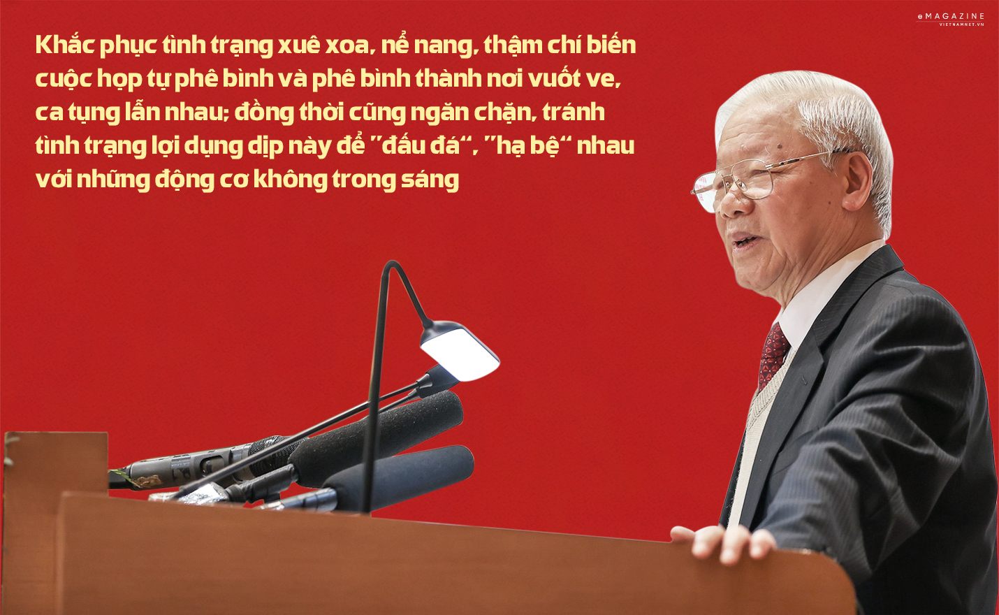Tổng Bí thư lưu ý, hết sức tránh làm lướt, làm qua loa, hình thức, chiếu lệ. Khắc phục tình trạng xuê xoa, nể nang, thậm chí biến cuộc họp tự phê bình và phê bình thành nơi vuốt ve, ca tụng lẫn nhau; đồng thời cũng ngăn chặn, tránh tình trạng lợi dụng dịp này để “đấu đá”, “hạ bệ” nhau với những động cơ không trong sáng; nghiêm khắc xử lý những trường hợp trù dập phê bình và vu cáo người khác. Những trường hợp sai phạm nghiêm trọng mà không thành khẩn, không tự giác, tập thể giúp đỡ mà không tiếp thu thì phải xử lý thích đáng.
