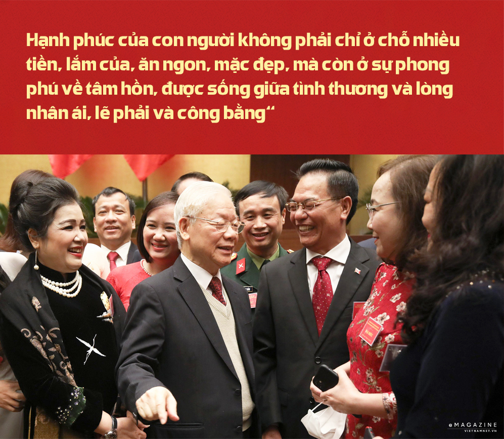 “Hạnh phúc của con người không phải chỉ ở chỗ nhiều tiền, lắm của, ăn ngon, mặc đẹp, mà còn ở sự phong phú về tâm hồn, được sống giữa tình thương và lòng nhân ái, lẽ phải và công bằng”, Tổng Bí thư đúc kết.