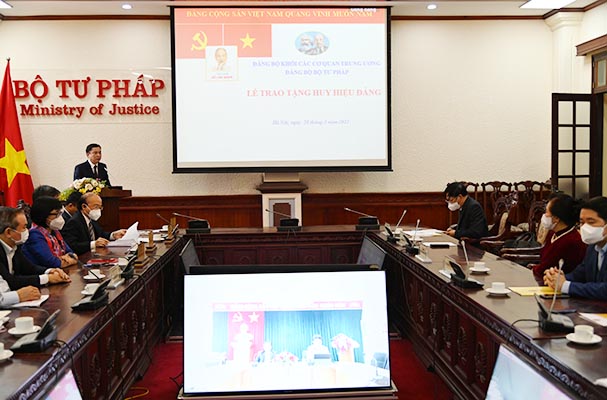 Buổi lễ trao Huy hiệu có sự tham dự của đồng chí Huỳnh Tấn Việt, Ủy viên Ban Chấp hành Trung ương Đảng, Bí thư Đảng ủy Khối các cơ quan Trung ương; đồng chí Đinh Xuân Tùng, Ủy viên Ban Thường vụ, Trưởng Ban Tổ chức Đảng ủy Khối. Về phía Bộ Tư pháp có đồng chí Phan Chí Hiếu, Bí thư Đảng ủy, Thứ trưởng Bộ Tư pháp, cùng các Thứ trưởng Bộ Tư pháp: Nguyễn Khánh Ngọc, Đặng Hoàng Oanh, Mai Lương Khôi, đồng chí Nguyễn Kim Tinh, Phó Bí thư thường trực Đảng ủy cùng các đồng chí Ủy viên Ban Chấp hành Đảng bộ, Trưởng các đoàn thể thuộc Bộ.