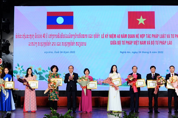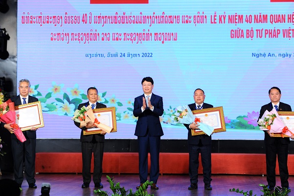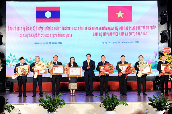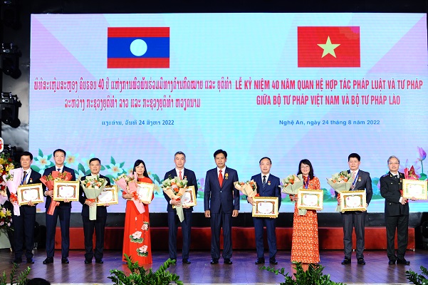 Tại lễ kỷ niệm, hai bên cũng đã trao tặng các hình thức khen thưởng cấp nhà nước ghi nhận công lao, thành tích của các tập thể và cá nhân trong củng cố mối quan hệ hữu nghị truyền thống, đoàn kết đặc biệt và hợp tác toàn diện Việt Nam - Lào. Nhân dịp Kỷ niệm 40 năm quan hệ hợp tác pháp luật và tư pháp giữa Bộ Tư pháp Việt Nam và Bộ Tư pháp Lào, Chủ tịch nước CHXHCN Việt Nam đã quyết định tặng thưởng “Huân chương độc lập” các hạng cho 4 đồng chí lãnh đạo Bộ Tư pháp nước CHDCND Lào; Quyết định tặng “Huân chương hữu nghị” cho 11 tập thể và 11 cá nhân; Quyết định tặng “Huy chương Hữu nghị” cho 4 tập thể và 15 cá nhân thuộc Bộ Tư pháp nước CHDCND Lào. Bộ trưởng Bộ Tư pháp nước CHXHCN Việt Nam cũng đã quyết định tặng kỷ niệm chương “Vì sự nghiệp Tư pháp” cho 4 cá nhân, tặng “Bằng khen của Bộ trưởng Bộ Tư pháp” cho 15 cá nhân. Dịp này, Chủ tịch nước CHDCND Lào cũng quyết định trao tặng Huân chương Lao động hạng Nhì cho đồng chí Lê Thành Long - Bộ trưởng Bộ Tư pháp Việt Nam; tặng Huân chương Lao động hạng Ba cho đồng chí Nguyễn Khánh Ngọc - Thứ trưởng; tặng Huân chương Tự do Ít - xa - la cho đồng chí Nguyễn Thanh Tịnh - Thứ trưởng Bộ Tư Pháp và tặng thưởng Huân chương Hữu nghị cho các tập thể và cá nhân thuộc Bộ Tư pháp Việt Nam.