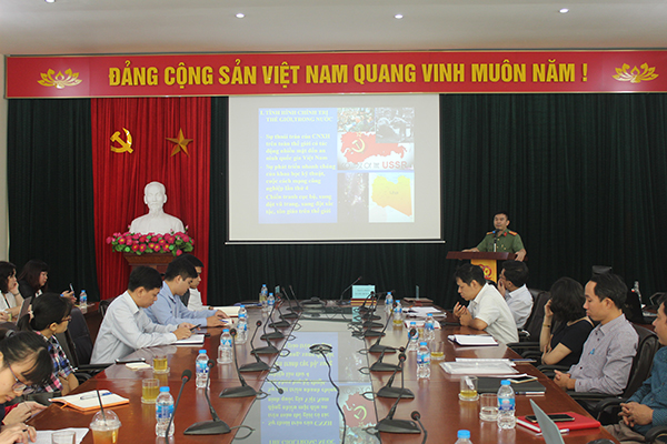 Phát biểu khai mạc buổi sinh hoạt chuyên đề, TS. Vũ Hoài Nam, Bí thư Chi bộ, Phó Tổng biên tập Tạp chí Dân chủ và Pháp luật cho biết, sự biến đổi của tình hình thế giới, khu vực đem lại cả thuận lợi và thời cơ, khó khăn và thách thức đan xen, đặt ra nhiều yêu cầu mới đối với sự nghiệp xây dựng và bảo vệ Tổ quốc. Việt Nam đang đứng trước những thách thức lớn về vấn đề an ninh chính trị xã hội và tình hình bảo vệ chủ quyền biển đảo, TS. Vũ Hoài Nam hy vọng buổi sinh hoạt sẽ giúp cho cán bộ, đảng viên, nhất là những cán bộ, đảng viên trẻ hiểu thêm về tình hình an ninh chính trị trong nước và thế giới, tình hình biển đảo quê hương, từ đó, củng cố lập trưởng tư tưởng, chính trị và xây dựng, hun đúc lòng yêu nước cho thế hệ trẻ.