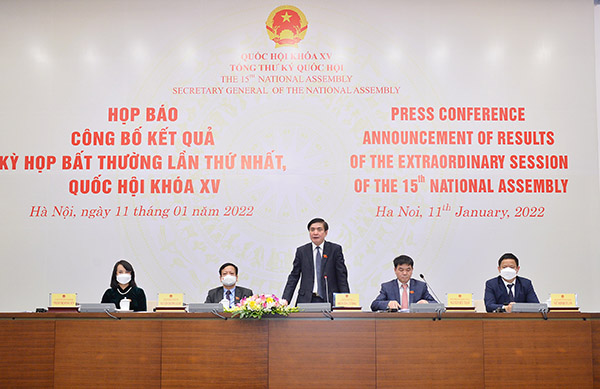 Chiều 11/01, tại Nhà Quốc hội, Ủy viên Trung ương Đảng, Tổng Thư ký Quốc hội, Chủ nhiệm Văn phòng Quốc hội Bùi Văn Cường chủ trì Họp báo công bố kết quả Kỳ họp bất thường lần thứ Nhất, Quốc hội khóa XV. Sau 4,5 ngày làm việc khẩn trương, trách nhiệm (từ ngày 04-11/01/2022), Kỳ họp đã thành công tốt đẹp, hoàn thành toàn bộ chương trình đề ra và thông qua nhiều vấn đề quan trọng, cấp bách,…