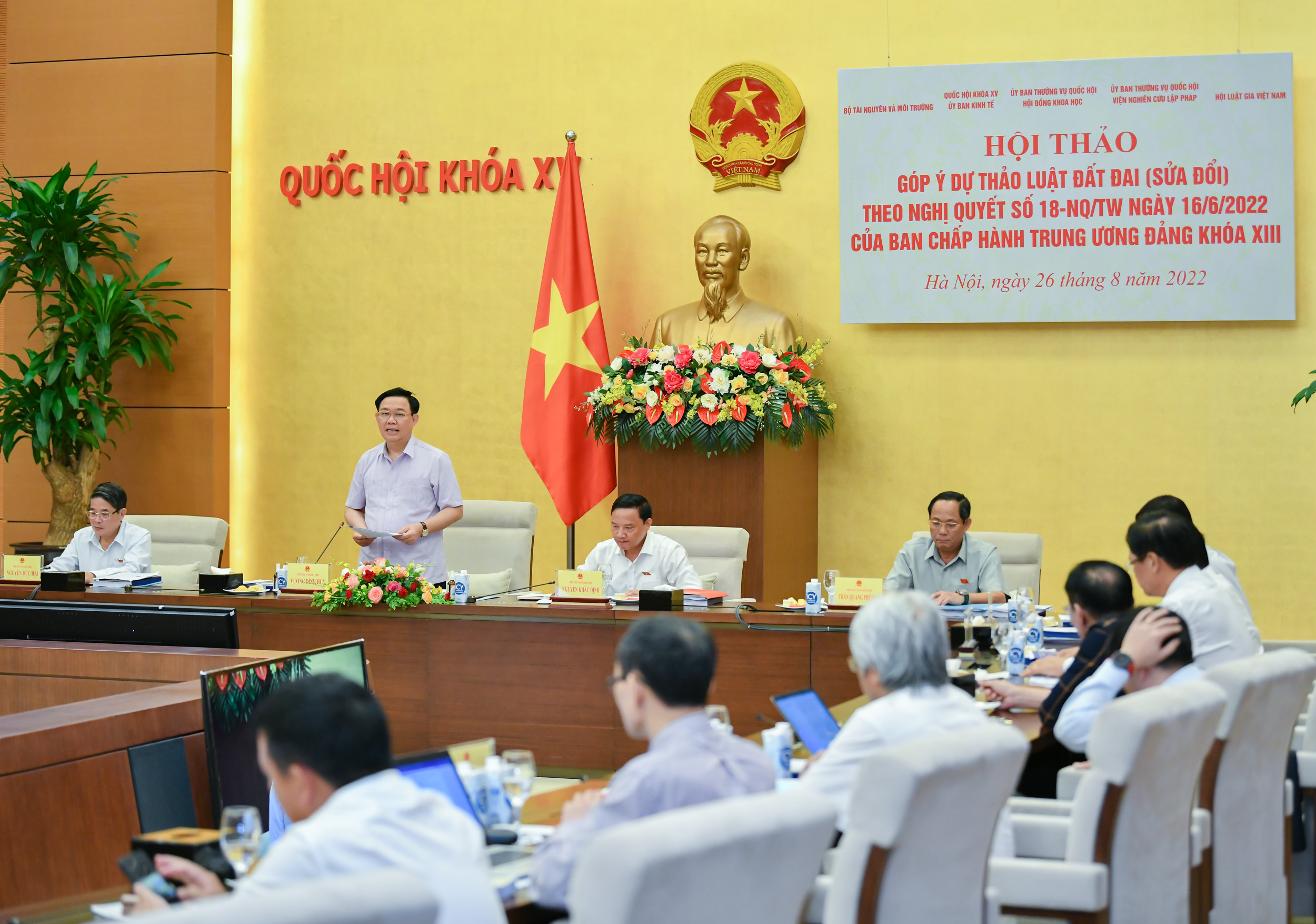 Phát biểu tại hội thảo “Góp ý dự thảo Luật Đất đai (sửa đổi) theo Nghị quyết số 18-NQ/TW ngày 16/6/2022 của Ban Chấp hành Trung ương Đảng khóa XIII”, chiều 26/8, GS.TS Vương Đình Huệ - Chủ tịch Quốc hội đã nêu rõ yêu cầu trong quá trình xây dựng Luật phải bài bản, công phu, kĩ lưỡng, phải có sự tham gia của toàn hệ thống chính trị và toàn dân bởi đây là dự án luật khó, tác động lớn đến mọi mặt đời sống kinh tế - xã hội và mọi chủ thể.