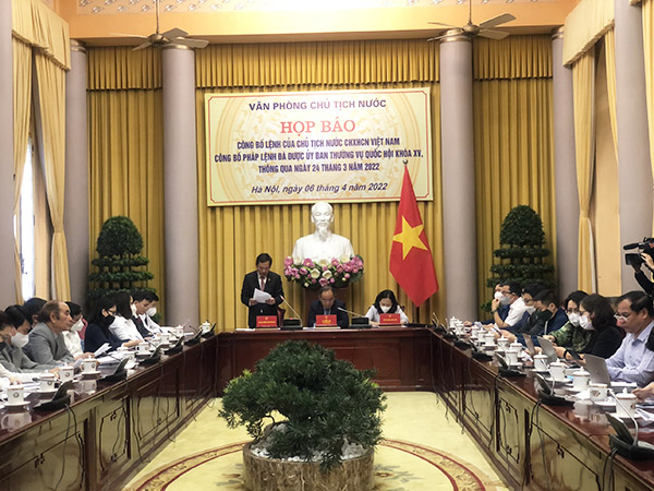 Sáng ngày 06/4, Văn phòng Chủ tịch nước họp báo công bố Lệnh của Chủ tịch nước về việc công bố Pháp lệnh Trình tự, thủ tục Tòa án nhân dân xem xét, quyết định việc đưa người nghiện ma túy từ đủ 12 tuổi đến dưới 18 tuổi vào cơ sở cai nghiện bắt buộc đã được Ủy ban Thường vụ Quốc hội khóa XV, phiên họp thứ 9 thông qua ngày 24/3/2022. Ông Lê Khánh Hải, Chủ nhiệm Văn phòng Chủ tịch nước chủ trì họp báo.