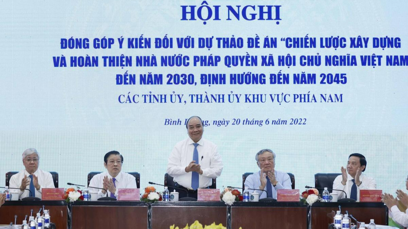 Chủ tịch nước Nguyễn Xuân Phúc khẳng định, việc nghiên cứu lý luận, tổng kết thực tiễn để xây dựng và hoàn thiện Nhà nước pháp quyền XHCN Việt Nam là một chủ trương hoàn toàn đúng đắn, phù hợp với xu thế thời đại, với yêu cầu thực tiễn và phù hợp với mục tiêu xây dựng đất nước giàu mạnh, mang lại ấm no, hạnh phúc cho nhân dân.